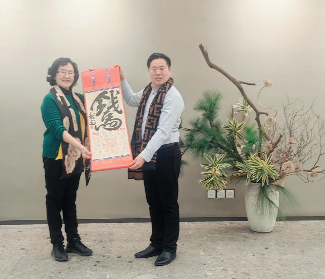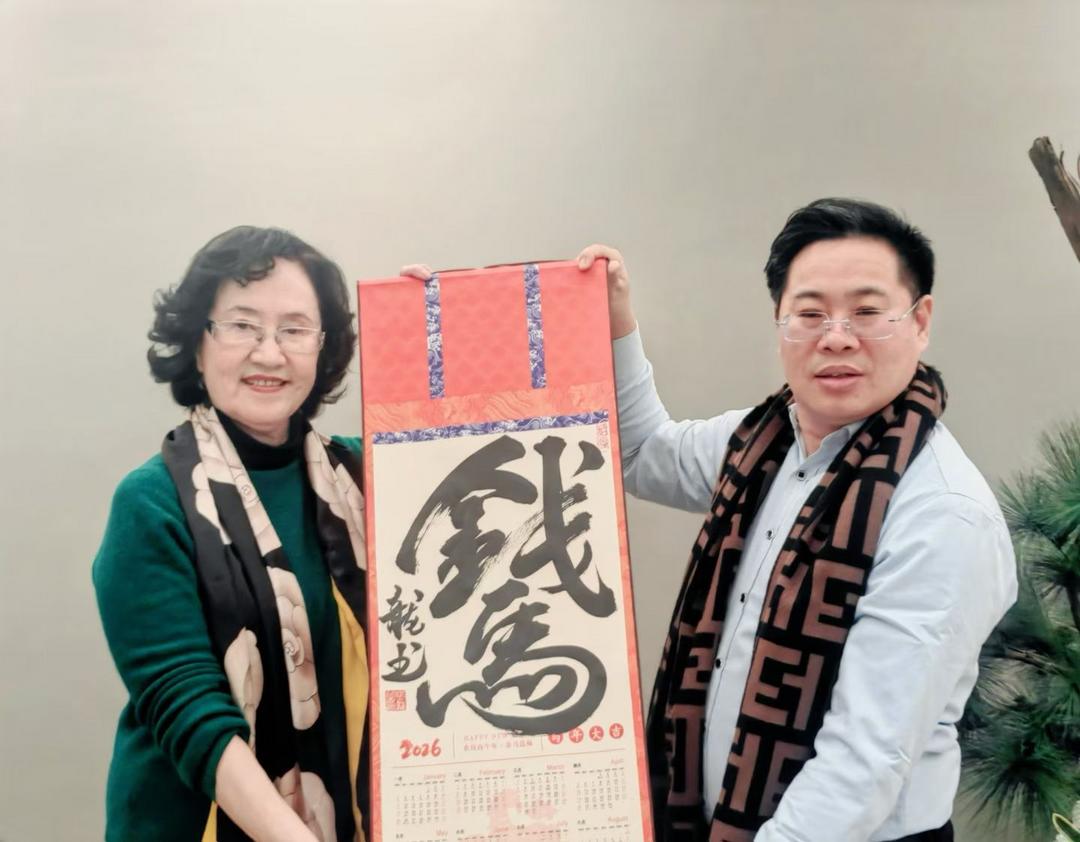 会晤现场氛围雅致温馨,张龙先生怀着对艺术前辈的由衷敬意与深切景仰,郑重向冯健雪大师敬赠其独创“创意龙书”扛鼎之作——《马上有钱》。此作为丙午马年专属匠心之作,以张龙先生独步艺林的“龙书”笔法挥毫而成,笔墨苍劲灵动、线条如龙游九天,章法严谨疏密有致,四字一气呵成,视觉冲击力与艺术感染力兼具。作品将龙马精神与吉祥文化相融,既取“马到成功、财源广进”的美好寓意,贴合2026丙午马年的祥瑞气象,更寄托对冯健雪大师艺术生命长青、艺德永馨、生活富贵安康的真挚祝愿。作为张龙先生“创意龙书”的经典代表作,《马上有钱》以笔墨立心、以意象传情,将传统书法的笔墨韵味与当代审美巧妙融合,成为兼具艺术价值与文化内涵的馈赠佳品。