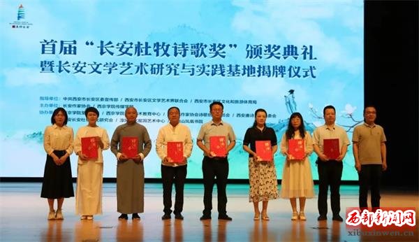 行进: 西安长安杜牧文化研究会参与发起并协办了首届“长安杜牧诗歌奖”活动。活动共征集到来自全国32个省市自治区和海外近500位诗人的3300多首诗作,以及40余位诗评人的50余篇诗歌评论,最终有14位诗人、作家的作品获奖。2024年2月,长安作家协会对外公布获奖名单,获奖作品刊登在第八期《长安文学》杂志。这次活动更进一步继承和发扬了杜牧的文学精神,长安作家协会与西京学院传媒学院在典礼现场,共同设立“长安文学艺术研究与实践基地”,为校内外文学与音乐的交流搭建起桥梁,加强校地融合,活跃文学艺术创作氛围。领奖那天下午,“长安杜牧诗歌奖”的获奖作者及部分嘉宾,还专程参观游览了杜公祠、兴教寺、司马村杜氏祖茔等地,并在我们司马村杜牧纪念馆作了交流,以文艺之力量宣传展示长安魅力。